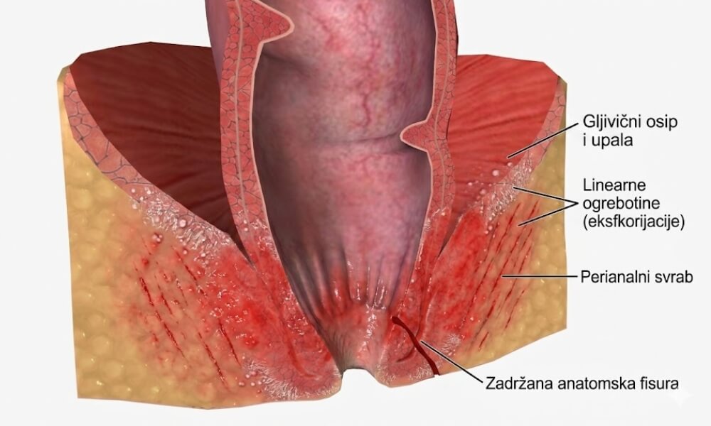 | Svrab uz gnojni sekret, otok, bol ili krvarenje | Fistula, apsces ili druga anorektalna promena | Potreban je proktološki pregled |