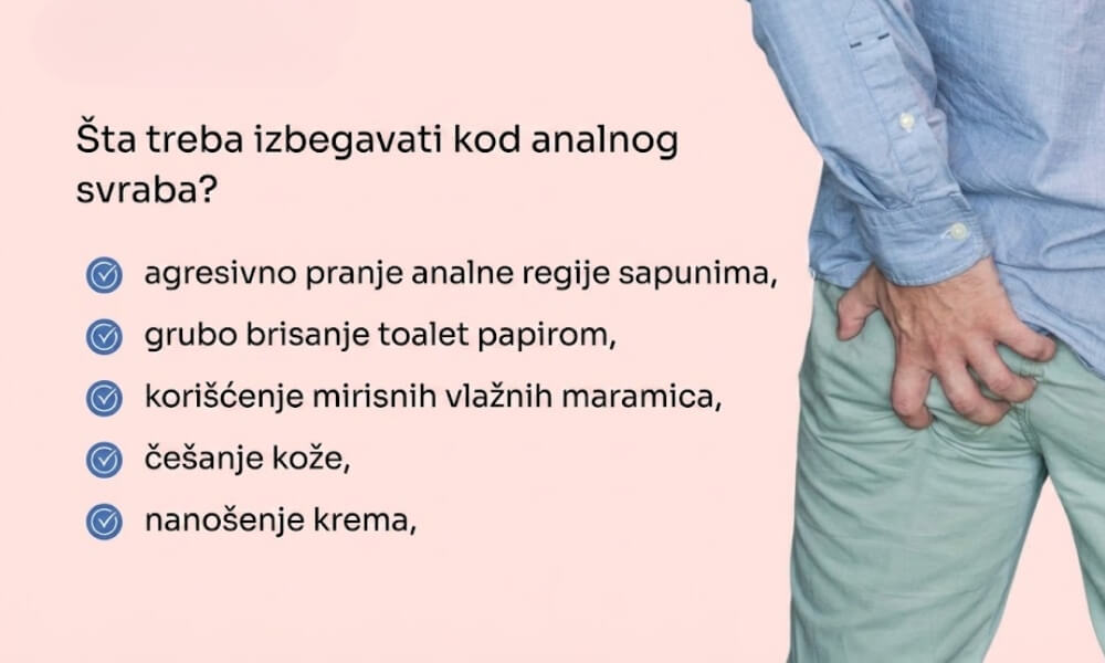 Kod svraba anusa najčešća greška je samostalno korišćenje preparata bez jasnog uzroka. Svrab može da nastane zbog iritacije, hemoroida, fisure, infekcije, dermatitisa ili parazita.